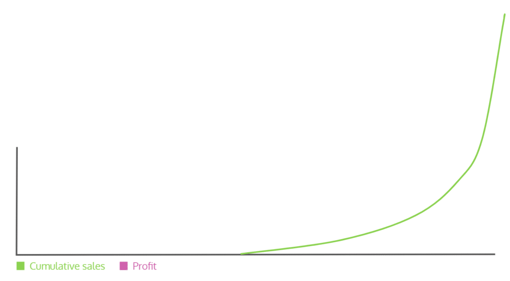 Your cumulative sales go up, and your monthly profit is tidy but small.