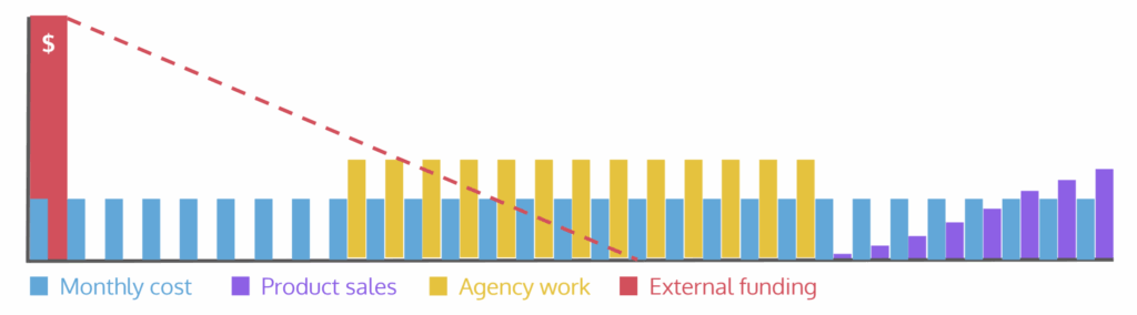 They usually start off with a group of founders, and maybe some ideas and connections, but not a lot else. They’ve got a monthly cost, but aren’t selling their time in agency work. They’re investing it in a product that hopefully will sell in the future.