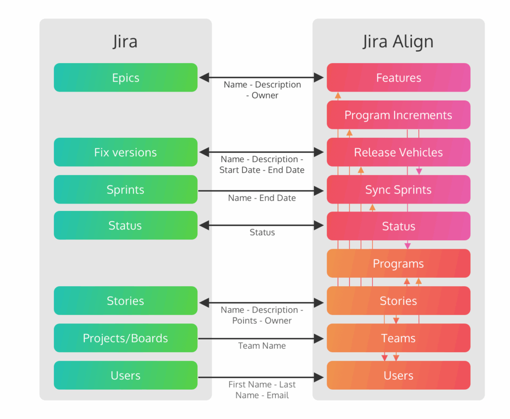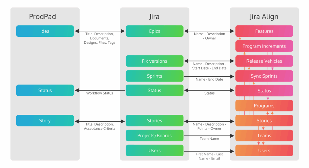 Jira and Align have bidirectional status and data updates, while ProdPad will receive the status update directly from Jira (either on its own, or influenced by updates from Align).