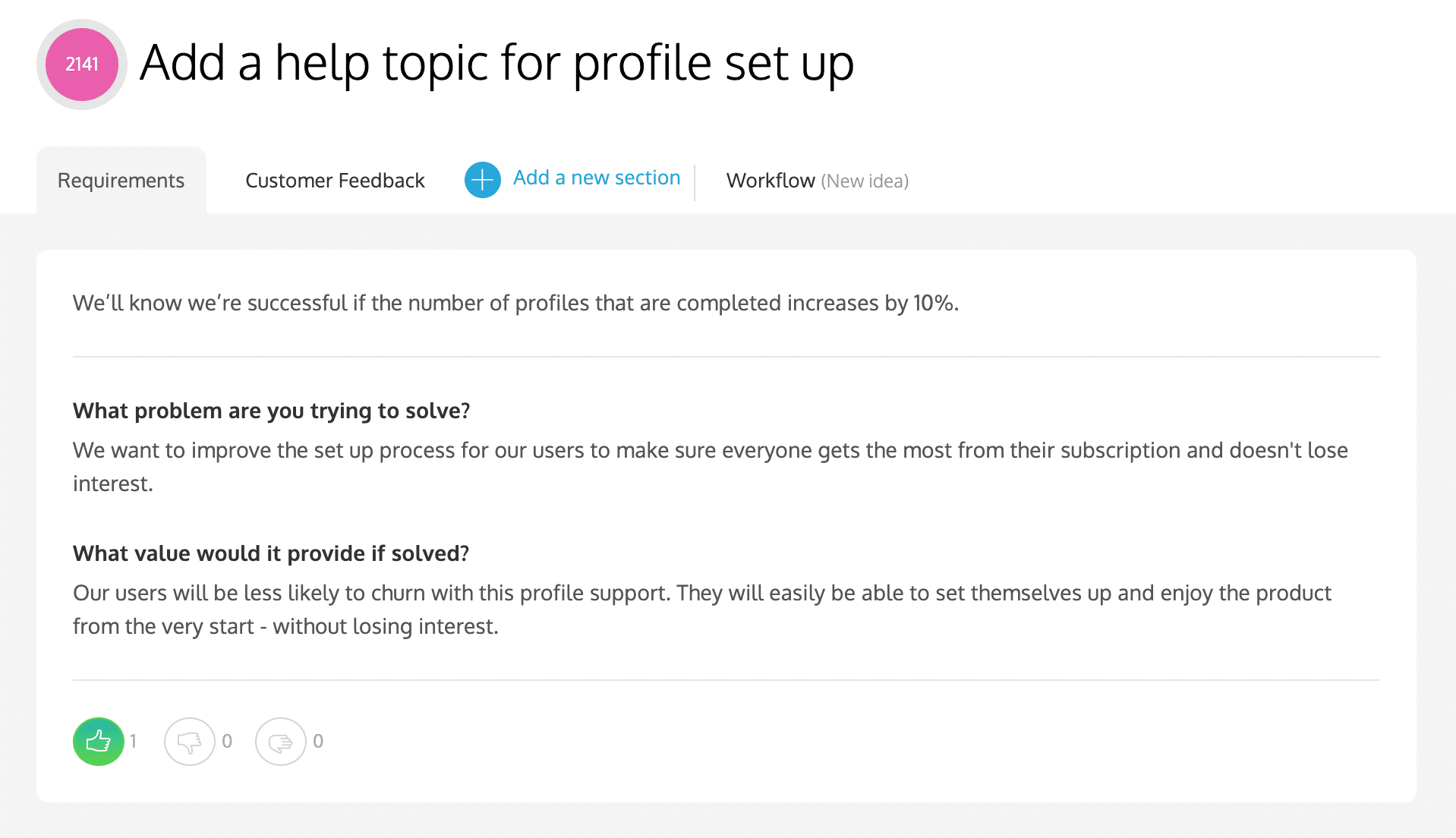This is the initiative. It is a problem definition, linked to the OKR so we can see that the work we are planning on our roadmap is helping us to achieve our company objectives. We can also see how we’re measuring success for this initiative in particular (other initiatives could be linked to the same key result).