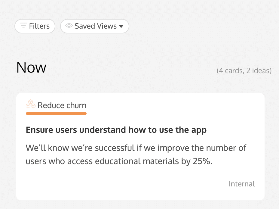 The way you measure success may be different depending on the granularity of the problem. Let’s consider an example like having a high amount of churn/cancellations. This is a product-level problem, and is easy to measure. There are lots of tools available to allow us easily to keep track of the number/value of customers who cancel each month. However, the ways in which we solve the problem are less defined – it could be more educational tools, in-app help, improved onboarding or a myriad other options. If we decide on educational tools, there are multiple options, such as videos, help articles, or live chat. We need to measure success at different levels. In ProdPad, we would represent this by creating a roadmap that is structured around objectives and key results, initiatives and ideas.