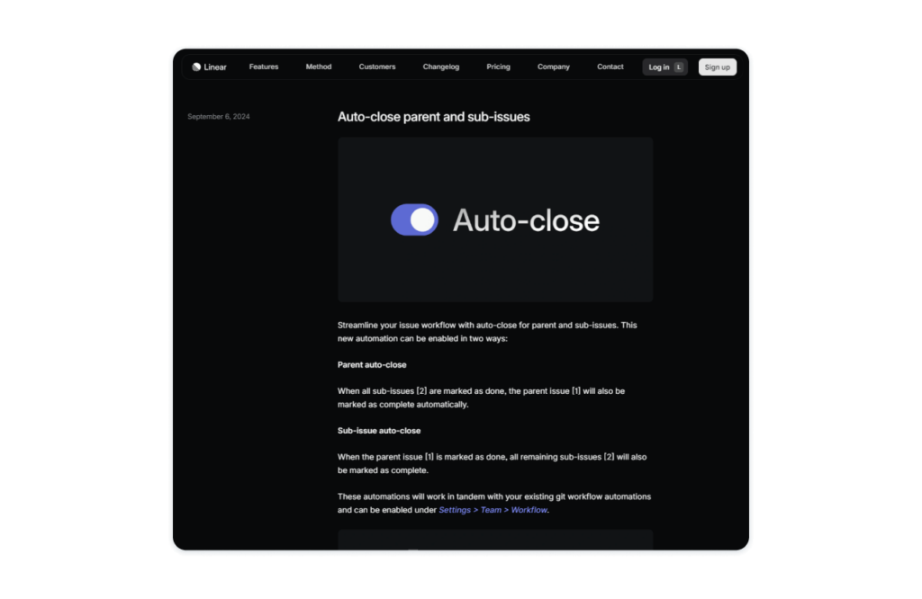 This links to a landing page that has a blog-like appearance, making it easy to quickly see the main details about each new release and easily scroll to see previous release notes. This creates a product story that users can read. Plus, if you want to learn more, there’s a CTA that takes the user to the full changelog for them to dive deeper into the changes.
