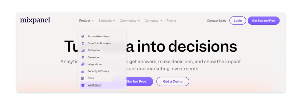 Mixpanel, the product analytics software has an interesting and effective approach on how to write release notes. They keep these notes in a changelog but include a link on their main website’s navigation to make it quick and easy to keep up to date with their updates and changes.
