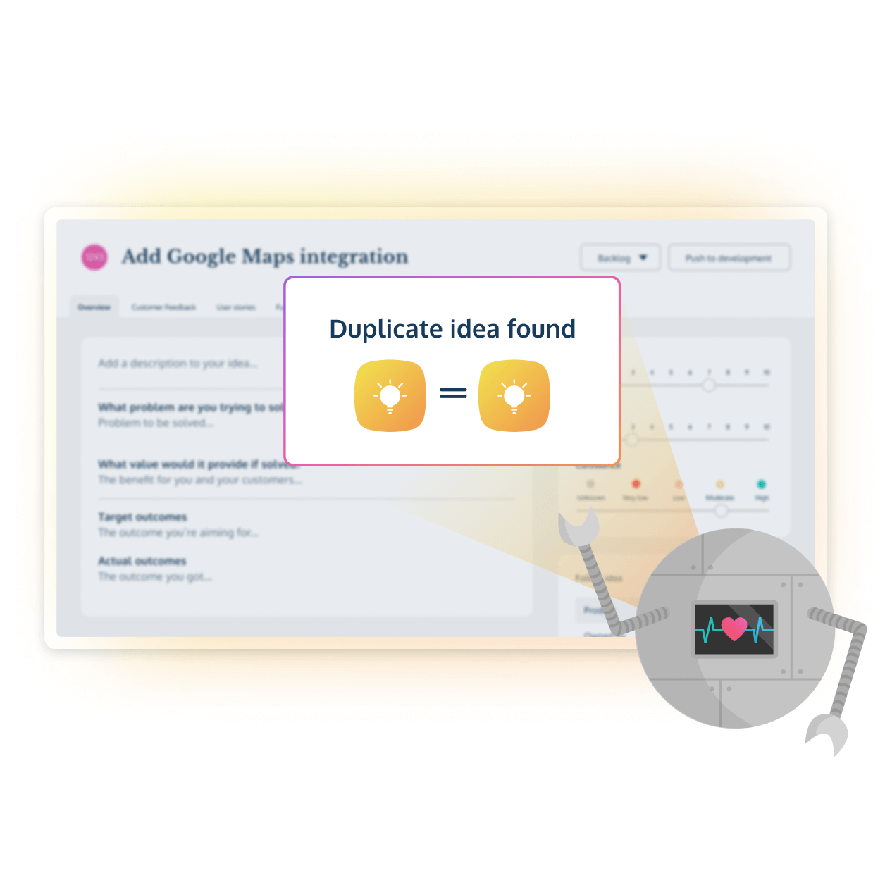 Now your mess is safely in ProdPad, CoPilot can evaluate what’s here and help you clean it up. From flagging all those duplicate ideas, right through to evaluating alignment to your product vision and suggesting improvements. Now you can clear out the crap and make the most of what’s left.