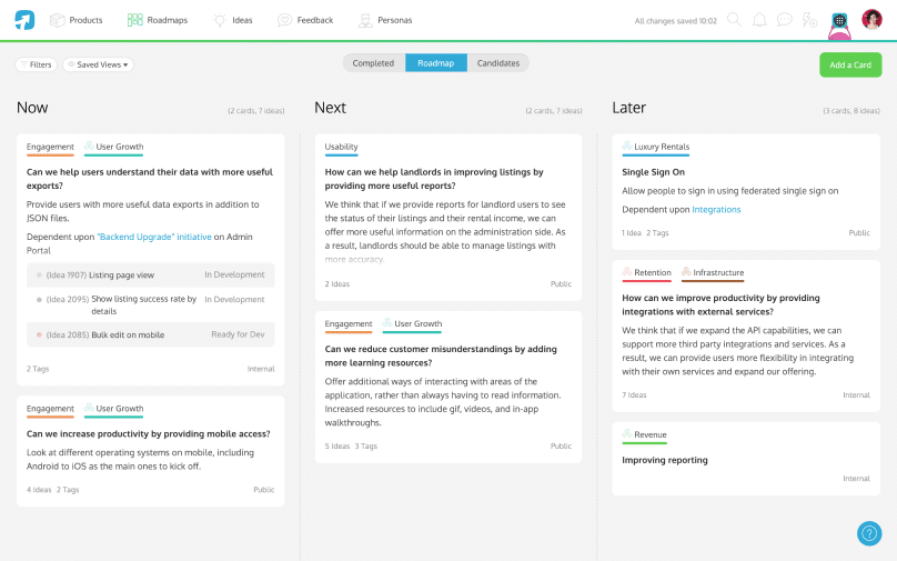 Your roadmap in ProdPad tells the bigger story of your product strategy. Each card in your ProdPad roadmap represents a problem to be solved, connected to your objectives and the experiments you’re running to meet each.
